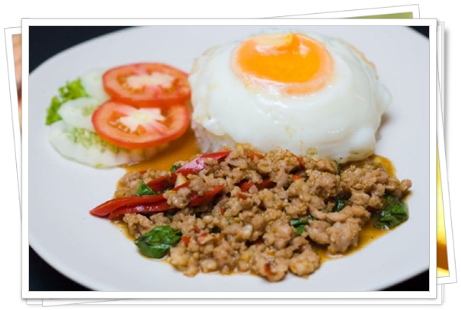 อันนี้คาดว่าเป็นอาหารที่ถูกปากคนไทยที่สุด ด้วยที่ว่ารสชาติออกแนว Hot & Spicy ถือเป็นเมนูพื้นฐานที่ทุกร้านอาหารตามสั่งต้องมีและแม่ครัวจะฝีมือชั่วแค่ไหนก็ต้องทำได้อร่อย ส่วนใหญ่จะนิยมสั่งกระเพราหมู/ไก่และบ่อยครั้งที่คนสั่งมักจะ ควบไข่ดาวเป็น “กระเพราหมู/ไก่+ไข่ดาว” นัยว่าเป็นคำคล้องจองกันดี เช่น “ป้าๆ กระเพราไก่ไข่ดาว จานหนึ่ง” อะไรประมาณนี้ค่ะ