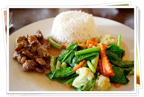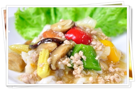 อันนี้เป็นเมนูสิ้นคิดที่สาวๆ มักชอบสั่ง คิดว่าคงเป็นเพราะความอร่อยของเนื้อหมูที่เอามาทอดในซอสน้ำมันหอยคลุกกับ พริกไทยเสร็จแล้วเอามาโปะกับข้าวสวยร้อนๆ กินกับแตงกวา ถ้าอยากเพิ่มความพิเศษให้กับเมนูอาจจะสั่งไข่ดาวมาเพิ่มได้ ถ้ากินกลางวันก็อิ่มไปถึงเย็นเลย