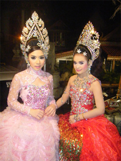 การแต่งกาย แต่งตัวด้วยเครื่องประดับสวยงาม เลียนแบบเครื่องทรงกษัตริย์ จึงเรียกว่าลิเกทรงเครื่อง บางครั้งก็ลดเครื่องแต่งกายที่แพรวพราวลงไป โดยตัวนายโรงยังแต่งเลียนแบบเครื่องทรงของกษัตริย์ในส่วนที่มิใช่เครื่องต้น เช่น นุ่งผ้ายกทอง สวมเสื้อเข้มขาบหรือเยียรบับ แขนใหญ่ถึงข้อมือ คาดเข็มขัดนอกเสื้อ ประดับเครื่องราชอิสริยาภรณ์ต่าง ๆ แต่ดัดแปลงเสียใหม่ เช่น เครื่องสวมศีรษะ เครื่องประดับหน้าอก สายสะพาย เครื่องประดับไหล่ ตัวนางนุ่งจีบยกทอง สวมเสื้อแขนกระบอกยาว ห่มสไบปักแพรวพราว สวมกระบังหน้าต่อยอดมงกุฎ ที่แปลกกว่าการแสดงอื่น ๆ คือสวมถุงเท้ายาวสีขาวแทนการผัดฝุ่นอย่างละคร แต่ไม่สวมรองเท้า