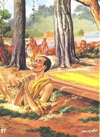 กฎแห่งกรรมแสดงผล เมื่อพระเทวทัตและคณะเดินทางมาถึงที่สระในบริเวณพระเชตวัน พวกศิษย์ที่ทำหน้าที่หามได้วางแคร่ลงที่ริมสระและได้ลงไปอาบน้ำกันอยู่นั้น พระเทวทัตได้ลุกขึ้นจากแคร่แล้ววางเท้าลงที่พื้นดิน พลันเท้าทั้งสองข้างของท่านก็ถูกธรณีสูบจมหายลงไปในแผ่นดิน