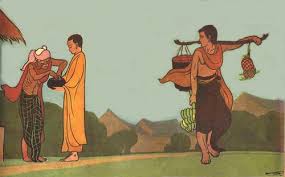 จึงอ้อนวอนสามีให้ไปหามาให้ บอกว่าหากมิได้บริโภคอาหารที่ต้องการนี้จะต้องตายแน่นอน ฝ่ายสามีผู้มีกรรมทนคำอ้อนวอนต่อไปไม่ไหว่และเกรงว่านางจักตาย จึงคิดออกอุบายปลอมตัวเป็นพระภิกษุและด้วยความเป็นพระใหม่ที่ปลอมตัวมาจึงทำให้มีความระมัดระวังสำรวมกายในเรื่องต่างๆมากเพราะกลัวคนจับผิดได้