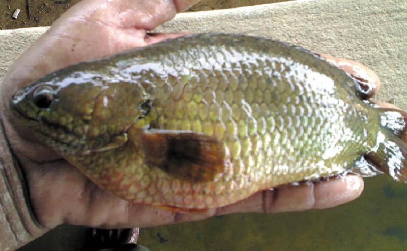 ปลาหมอ ปลาน้ำจืดชนิดหนึ่ง มีชื่อวิทยาศาสตร์ว่า Anabas testudineus ในวงศ์ปลาหมอ (Anabantidae) มีรูปร่างป้อม ลำตัวแบนข้าง ตาโต ปากกว้าง ขอบฝาปิดเหงือกหยักแข็ง เกล็ดใหญ่คลุมทั้งลำตัว มีขอบเกล็ดแบบหยัก ผิวสาก เส้นข้างลำตัวขาดตอน ครีบหลังยาวเกือบเท่าความยาวลำตัว มีก้านครีบแข็งแหลมคมจำนวนมากเช่นเดียวกับครีบก้น แต่ครีบก้นสั้นกว่า ครีบอกเล็กเป็นรูปไข่ ครีบหางปลายมน ตัวมีสีเขียวมะกอกและมีลายประสีคล้ำที่ข้างลำตัว ครีบใส ลำตัวด้านท้องมีสีเหลือง ขอบฝาปิดเหงือกตอนบนมีแต้มสีคล้ำ มีอวัยวะช่วยหายใจเป็นแผ่นริ้วย่น ๆ อยู่ตอนบนของของช่องเหงือก จึงสามารถฮุบอากาศจากบนผิวน้ำได้โดยตรงโดยไม่ต้องรอให้ออกซิเจนละลายในน้ำ และสามารถอยู่บนบกหรือพื้นที่ขาดน้ำได้เป็นระยะเวลานาน ๆ ซึ่งในฤดูฝนบางครั้งจะพบปลาหมอแถกเหงือกไถลคืบคลานไปบนบกเพื่อหาที่อยู่ใหม่ได้ ด้วยความสามารถอันนี้ในภาษาอังกฤษจึงเรียกปลาชนิดนี้ว่า "Climbing perch" หรือ "Climbing gourami"