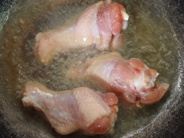 -ตั้งกระทะใส่น้ำมันพืชให้เดือด นำไก่ลงทอดให้สุกและเหลืองน่าทาน
