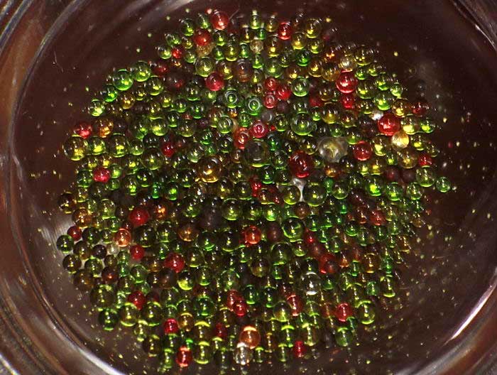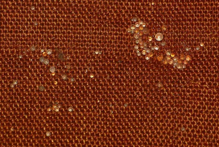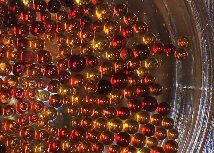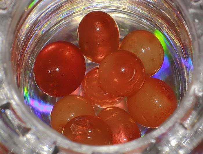 ส่วนของชานหมากหากดูด้วยตาเปล่าจะมีขนาดเล็กว่านี้ เห็นเป็นเศษหมากและส่วนที่มีสีขาว เป็นประกายเมื่อโดนแสงไฟ น้ำหมากสีแดงได้หายไปกลายไปเป็นองค์กลมสีแดงชมพู