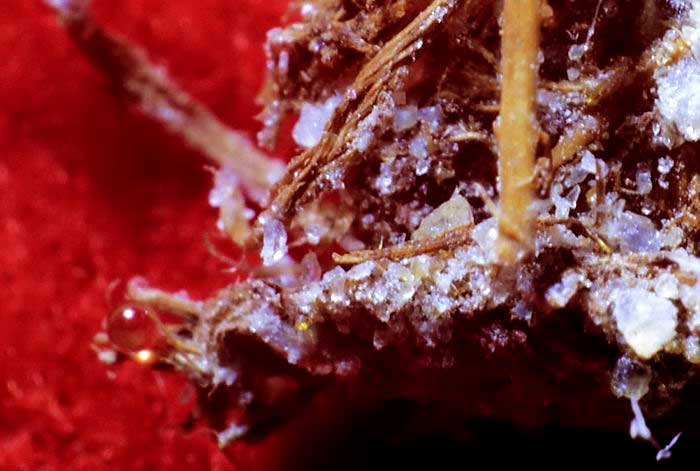 ในส่วนขอชานหมากหลวงตา เมื่อใช้เลนส์กำลังขยายสูงถ่าย ปรากฎว่ามีผลึกสีขาวใสเล็ก ๆ สีเขียวอ่อน ๆ สีแดง สีเหลือง ปะปนกันอยู่จำนวนมาก