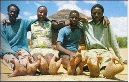 - คนในเผ่าส่วนมากมีความผิดปกติของร่างกาย ในบริเวณเท้า คือ เท้าทั้งสองข้างจะไม่มีนิ้วชี้ นิ้วกลาง และนิ้วนาง ทำให้เหลือเฉพาะนิ้วโป้ง และนิ้วก้อยเท่านั้น และทั้งสองนิ้วที่เหลือยังมี