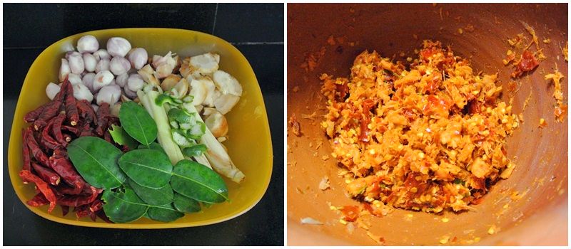 นำหอมแดง พริกขี้หนู ข่า ผิวมะนาว ไปตำให้ละเอียด