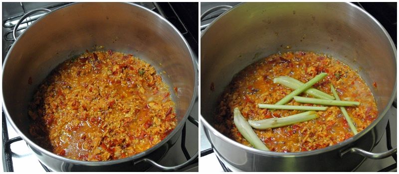 ตั้งหม้อ ใส่น้ำซุปลงไป 1 ถ้วย ใส่พริกแกงที่ตำลงไปละลายในน้ำซุป ใส่คระใคร้ที่บุบจนแตกลงไป