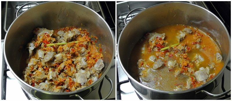 กวนให้ซี่โดรงหมูเข้ากันกับพริกแกง เติมน้ำซุปลงไปเพิ่มจนท่วม