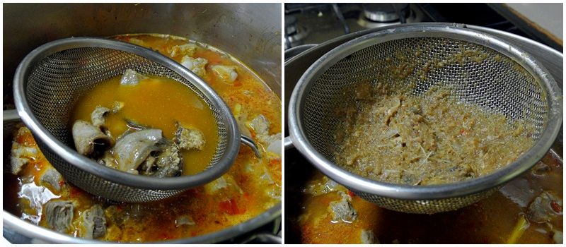 เอาปลาร้าใส่ตระแกรง เอาทัพพีขยี้เนื้อปลาร้าในหม้อแกง