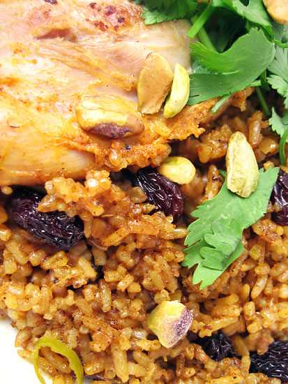 ผัดไปเรื่อยๆ ขูดก้นๆหม้อให้ออกมาให้หมด จนเริ่มแห้ง (ชิมรสเพิ่มเครื่องได้ตอนนี้) รอจนหอมใสเครื่องเข้ากันดีเกือบเป็น paste 4. นำข้าวที่หุงเครื่องเทศไว้มาคลุกให้เข้ากัน ตามด้วยนมสดที่อุ่นกับ Saffron (นม 1/4 ถ้วย Saffron 1/2 ช้อนชา) ลูกเกดและเม็ดมะม่วงฯคั่ว ผัดจนเข้ากันดี กวาดข้าวไปข้างนึงของหม้อแล้วเรียงไก่ลงไปที่ก้นหม้อ กลบไก่ด้วยข้าว ปิดฝา เข้าเตาอบ 350F ครึ่งชั่วโมงก่อนจะรับประทาน โรยผักชีซอยก่อนเสิร์ฟ ถ้าจะทานแบบพี่แขกจริงๆ ต้องทำ raita recipe มากินประกอบ