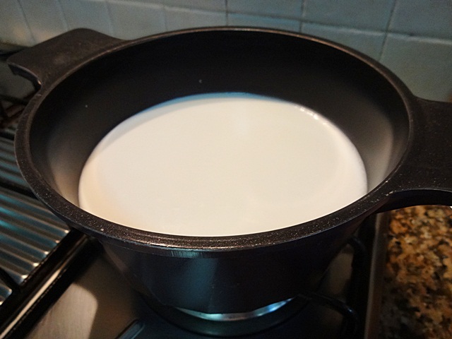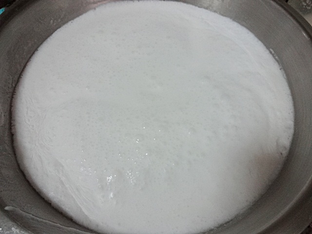 1. ผสมกะทิสด น้ำตาล และเกลือในหม้อ นำขึ้นตั้งไฟคนให้น้ำตาละลายหมดจนเดือด