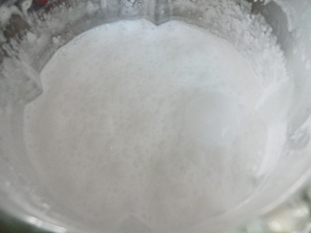 ในครั้งที่สองใส่ไข่ขาวลงไปตีด้วย จะสังเกตว่าเนื้อไอศกรีมขาวและฟูขึ้น