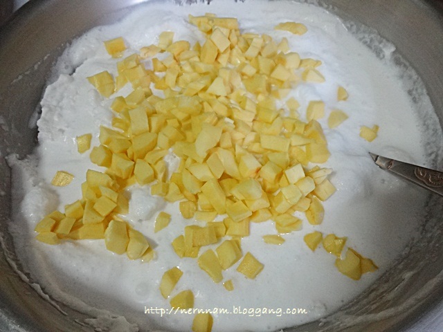 ในครั้งที่ 3 ขั้นตอนสุดท้ายเราหั่นขนุนใส่ลงใปในเนื้อไอศกรีมด้วยค่ะ