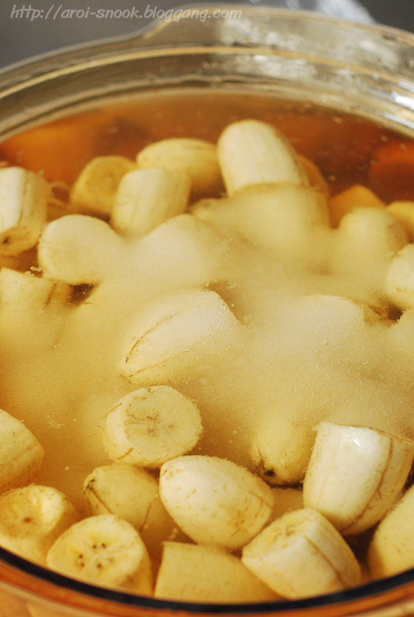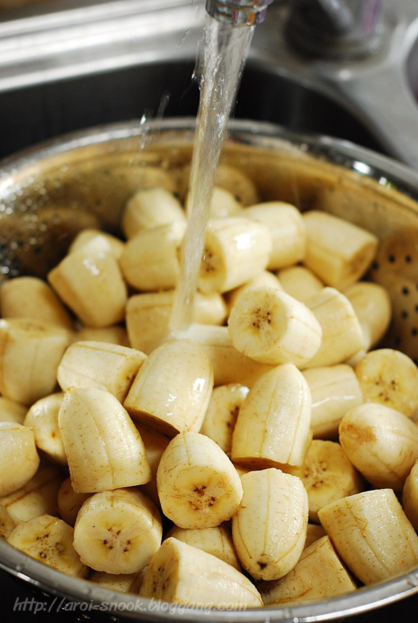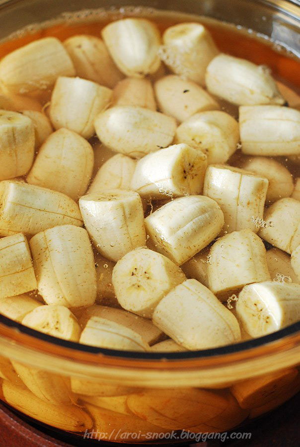 ถ้าเชื่อมกล้วยสุกไปหน่อย เราต้องแช่น้ำปูนใส ค่ะ