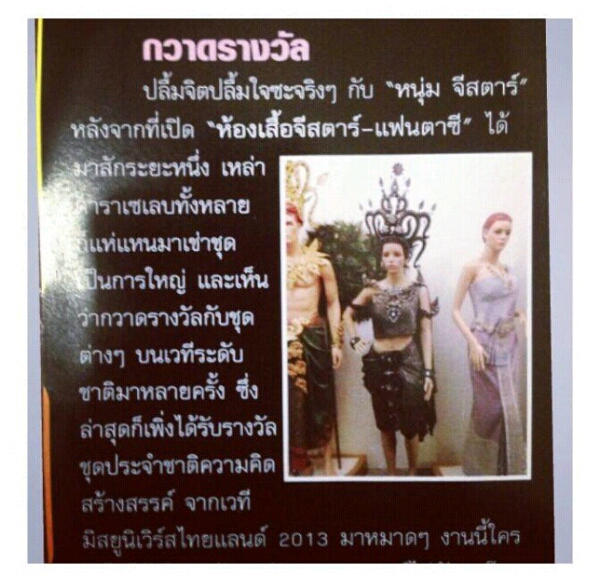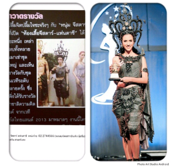 ชุดนี้พึ่งใด้รางวัล ชุดประจำชาติ ความคิดสร้างสรรค์ จากเวที Miss Univers Thailand 2013 (ภาพจากอินสตารแกรมเจ้าของชุด)