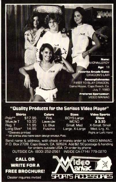 บริษัท Video Maniac เป็นหนึ่งในบริษัทที่โฆษณาในนิตยาสาร Electronic Games มาอย่างยาวนาน ซึ่งโฆษณาจะมีอยู่เกือบทุกฉบับของนิตยสารนี้ โดยอุปกรณ์กีฬานี้ต้องขายให้ได้แน่ๆ แต่ขายให้ใคร !!! เสื้อยืดราคา $11.95 (ค.ศ. 1983) ซึ่งถือว่าแพงไม่น้อย โดยเกือบ 30 ปีให้หลังเราสามารถซื้อเสื้อลิขสิทธิ์ของ Atari เพียงราคา $9.99 เท่านั้น