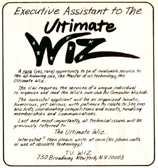 ถึงเวลาหางานกันแล้ว เพื่อเอาไปซื้อเกมกัน ข่าวดีก็คือ มีข่าวจ้างงานมากมายในนิตยาสาร Electronic Games ไม่ว่าจะเป็นการทำงานกับ Atari, Fisher-Price, 20th Century Fox และแม้กะทั่งงานสอนซ่อมตู้เกม Arcade แต่มีอยู่หนึ่งงานที่ให้โอกาสมนุษย์อย่างเราๆ ได้ทำกัน นั่นคืองานผู้ช่วยพ่อมดผู้ยิ่งใหญ่ พ่อมดผู้นี้เป็นปรมาจารย์ของทุกเทคโนโลยี และกำลังจะสร้าง Club for computer WizKids หรือ ชมรมคอมพิวเตอร์สำหรับพ่อมดตัวน้อยๆ และคิดว่าต้องการมนุษย์อย่างเรามาเป็นผู้ช่วยให้กับเขานั่นเอง