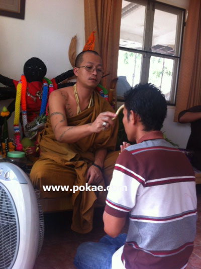 ถ่มน้ำลายใส่หัว แล้วก็ปลุกๆเสกๆ ลงเลขลงยันต์ บอกว่า ป้องกันภัยได้