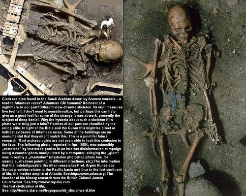 จากโครงกระดูกวัดจากหัวกะโหลกถึงปลายนิ้วเท้าพบว่ามีความ ยาวถึง 4 หลาครึ่ง สองข้างของศพมีดาบและขวานขนาดมหึมาวางนอนอยู่ข้างละเล่ม หัวขวานเป็นเหล็กหนา 6 นิ้ว ส่วนดาบก็เป็นเหล็กสองคมยาว 2 หลา รวมกับตัวด้ามถืออีก 16 นิ้วเป็น 2 หลา 16 นิ้ว...ศพซึ่งมีแต่กระดูกพบว่ามีหัวกะโหลกหน้าผากกว้างถึง 18 นิ้ว มีกรามใหญ่และมีฟันยาวยื่นขนาด 6 นิ้ว กว้าง 2 นิ้ว