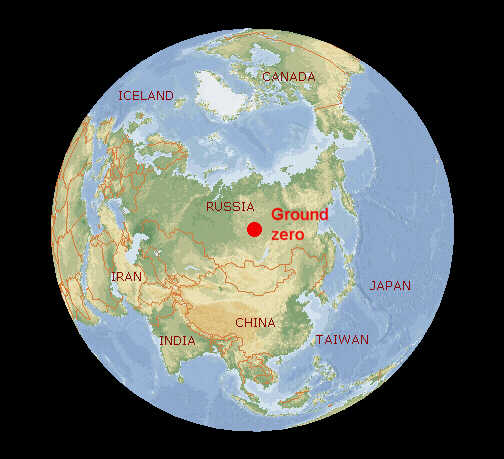 การระเบิดครั้งนี้เกิดขึ้นที่แม่น้ำพอดกาเมนนายา ทังกัสกา (บางที่เรียกโปดคาเมนนายา ทังกัสก้า)} (Podkamennaya Tunguska River) แคว้นคราสนายาร์ส์ค ในไซบีเรียดินแดนในครอบครองที่หนาวเหน็บทุรกันดารอันขึ้นชื่อของรัประเทศรัส เซีย วันนั้นเป็นวันที่ 30 มิ.ย.1908(ในยุคนั้น ถือกันว่าเป็นวันที่ 17 มิถุนายน เนื่องจากรัสเซียยุคนั้น ใช้ปฏิทินแบบเก่า ซึ่งช้ากว่าปฏิทินแบบที่เราใช้กันอยู่ในปัจจุบันหลายวัน)