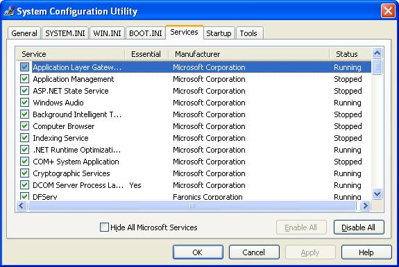 6.เลือกที่ Disable All(เนื่องจากซ่อน Servicess ทั้งหมดแล้ว จึงสามารถ ปิดที่เหลือได้ทั้งหมด)