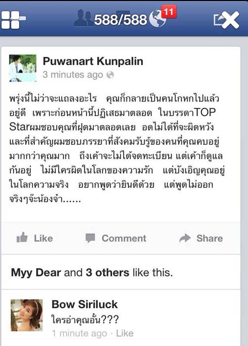 “จริงๆผมไม่ได้ตั้งใจให้มันเป็นประเด็น เพราะตอนที่โพสต์ก็นั่งจัดรายการวิทยุอยู่ ถ้าหากว่าใครมองว่ามันแรงไป ผมก็ต้องขออภัยจริงๆ ไม่ได้มีเจตนาหรือมีอะไรส่วนตัวกับใครทั้งสิ้น ไม่รู้จะพูดว่าอะไรดี ก็ตามที่เขาแถลงล่ะครับ ยังไงมันก็ต้องบอกว่าเป็นเรื่องที่น่าแสดงความยินดีด้วยใช่ไหมครับ ถ้าเขาทำด้วยความสุขเราก็ต้องยินดีด้วย ส่วนคนที่จะได้รับผลกระทบจากมันซึ่งเราบังเอิญรู้จัก เราก็ให้กำลังใจกันไปแล้วกัน ถ้าไปพูดอะไรมากกว่านี้มันก็ไม่ใช่เรื่องของผมจริงๆ อาจจะไม่ใช่เรื่องของใครหลายคนอีกเยอะแยะเต็มไปหมดอีกเลยด้วย โดยส่วนตัวจริงๆก็ชอบเขามากเลยนะ”