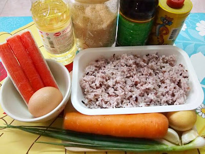 ข้าวสวย ปูอัด ไข่ไก่ แครอท ต้นหอม หอมหัวใหญ่ กระเทียม น้ำมันพืช พริกไทย น้ำตาลทราย ซอสปรุงรส |