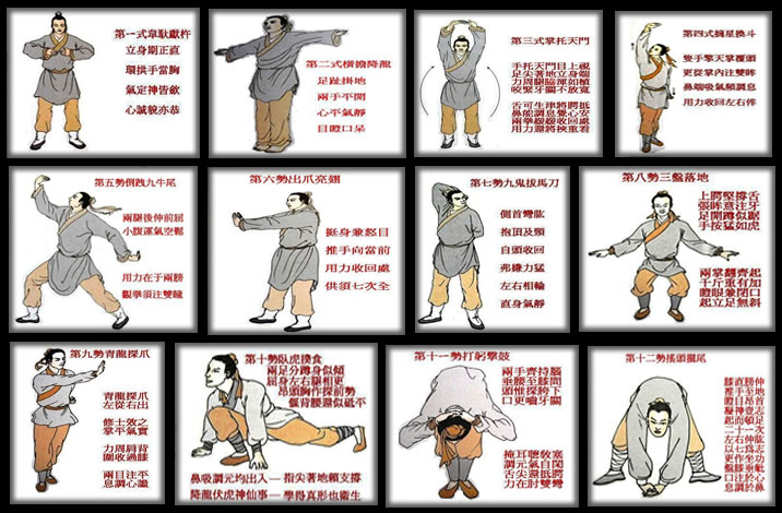ต่างมีทั้งหมด 12 กระบวนท่า เช่นกัน ตำรานี้ใช้สติเป็นที่ตั้ง อิริยาบถช้าๆ นุ่มนวล เป็นหัวใจของการบริหารลมหายใจเข้าออกอย่างช้าๆลึก และแผ่วเบา เป็นปัจจัยเอื้ออำนวยให้การบริหารเกิดประสิทธิภาพอย่างสมดุล