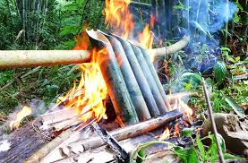 5. นำกระบอกไม้ไผ่ไปตั้งไฟ แล้วเอาใบไม้อุดปากกระบอกไม้ไผ่ ใช้ไฟไม่ต้องแรงมาก ถ้าเป็นถ่านได้ยิ่งดี