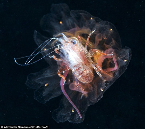 Lion’s Mane Jellyfish: จะเห็นว่ายังมีสิ่งมีชีวิต อาศัยอยู่ภายในท้องของแมงกะพรุน ซึ่งเป็นผู้ล่า