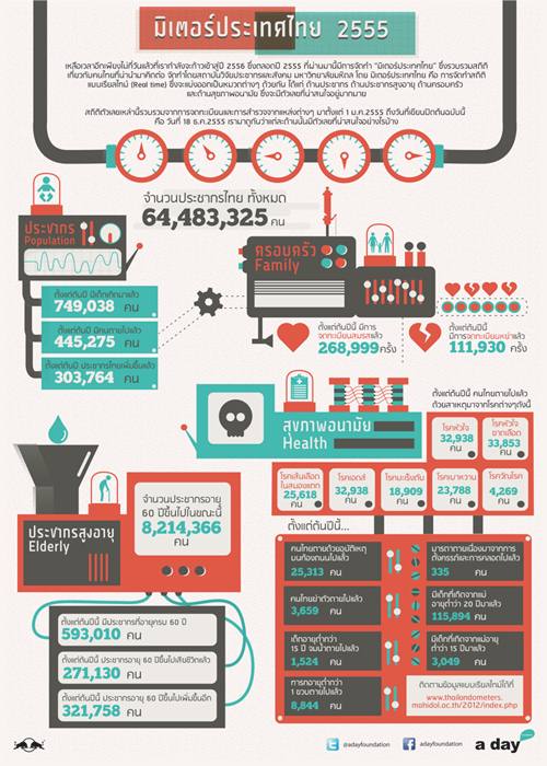 ตลอดปี 2555 ที่ผ่านมานี้มีการจัดทำ “มิเตอร์ประเทศไทย” ซึ่งรวบรวมสถิติเกี่ยวกับคนไทยที่น่านำมาคิดต่อ จัดทำโดยสถาบันวิจัยประชากรและสังคม มหาวิทยาลัยมหิดล โดยมิเตอร์ประเทศไทย คือ การจัดทำสถิติแบบเรียลไทม์ (Real time) ซึ่งจะแบ่งออกเป็นหมวดต่างๆ ด้วยกัน ได้แก่ ด้านประชากร ด้านประชากรสูงอายุ ด้านครอบครัว และด้านสุขภาพอนามัย ซึ่งจะมีตัวเลขที่น่าสนใจอยู่มากมาย