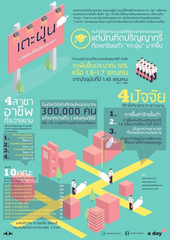 นอกจากมลพิษในกรุงเทพฯ จะเยอะอยู่แล้ว ตอนนี้มีโพลล์สำรวจออกมาว่า “ฝุ่น” จะยิ่งตลบหนาแน่นกันกว่าเดิม ซึ่งเจ้า “ฝุ่น” ที่ว่านี้ ไม่ได้หมายถึงมลพิษหรอกนะ แต่หมายถึง “เตะฝุ่น” ต่างหาก เพราะมีการสำรวจออกมาว่า บัณฑิตจบใหม่จะต้องเผชิญกับปัญหา “ว่างงาน” อย่างแน่นอน งั้นเรามาดูกันว่าอาชีพหรือสาขางานไหนที่มีความเสี่ยงมากที่สุด