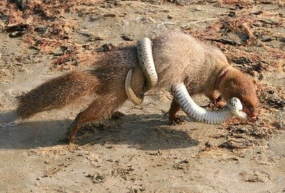 ....ทั้งสองสู้กันเป็นพัลวัน พังพอนกัดไม่ปล่อยทั้งที่ตัวเล็กกว่ามาก สุดท้ายพังพอนรวบรวมพลังสุดชีวิตกดเขี้ยวเต็มแรง เลือดงูพุ่งกระฉูดเต็มตัวพังพอน งูใหญ่ทรุดฮวบทันทีตายคาปากพังพอน สักพักแม่กลับมาถึงบ้าน พังพอนดีใจในฐานะที่ทำความดีความชอบ ปกป้องลูกของเจ้านายให้รอดชีวิต จากงูร้ายได้ ก็วิ่งไปรับหน้าแม่ที่หน้าบ้าน พอวิ่งไปถึงหน้าบ้านแม่เห็นตัวพังพอนเต็มไปด้วยเลือดก็ตกใจ