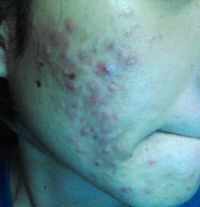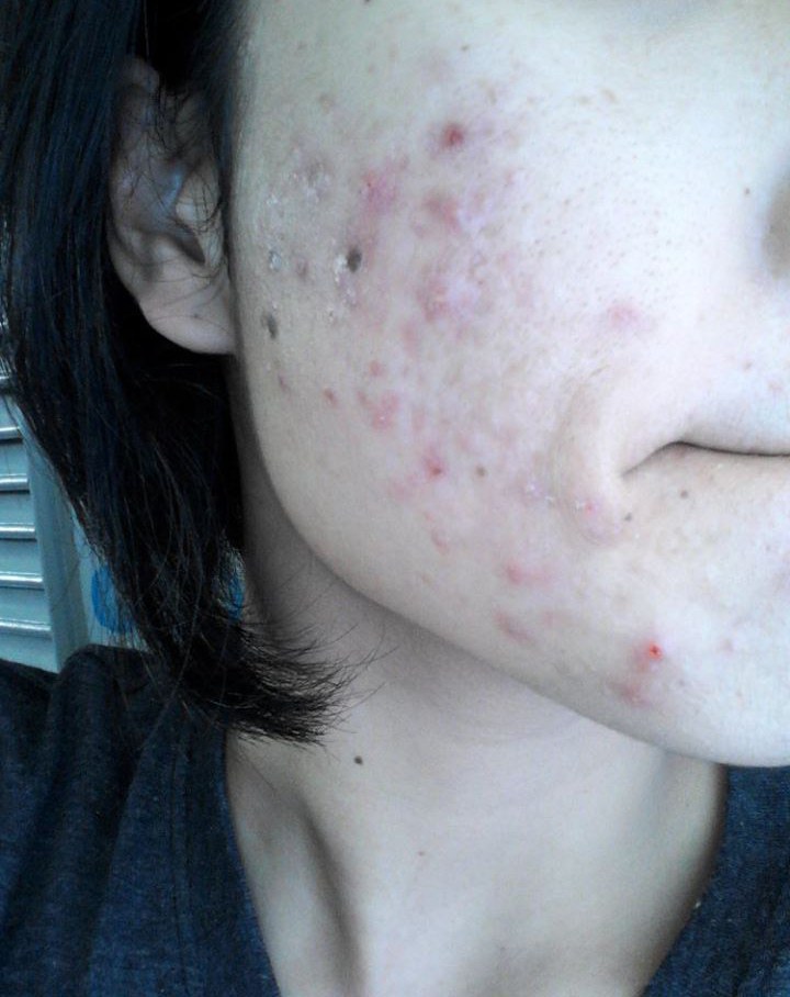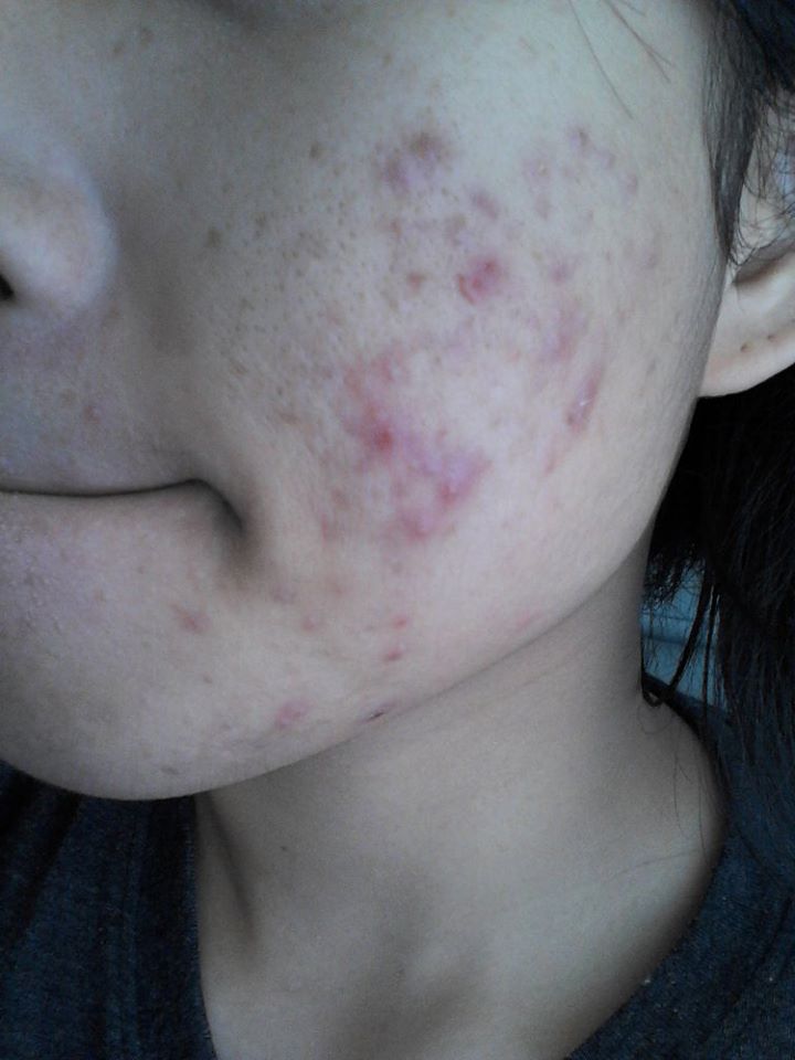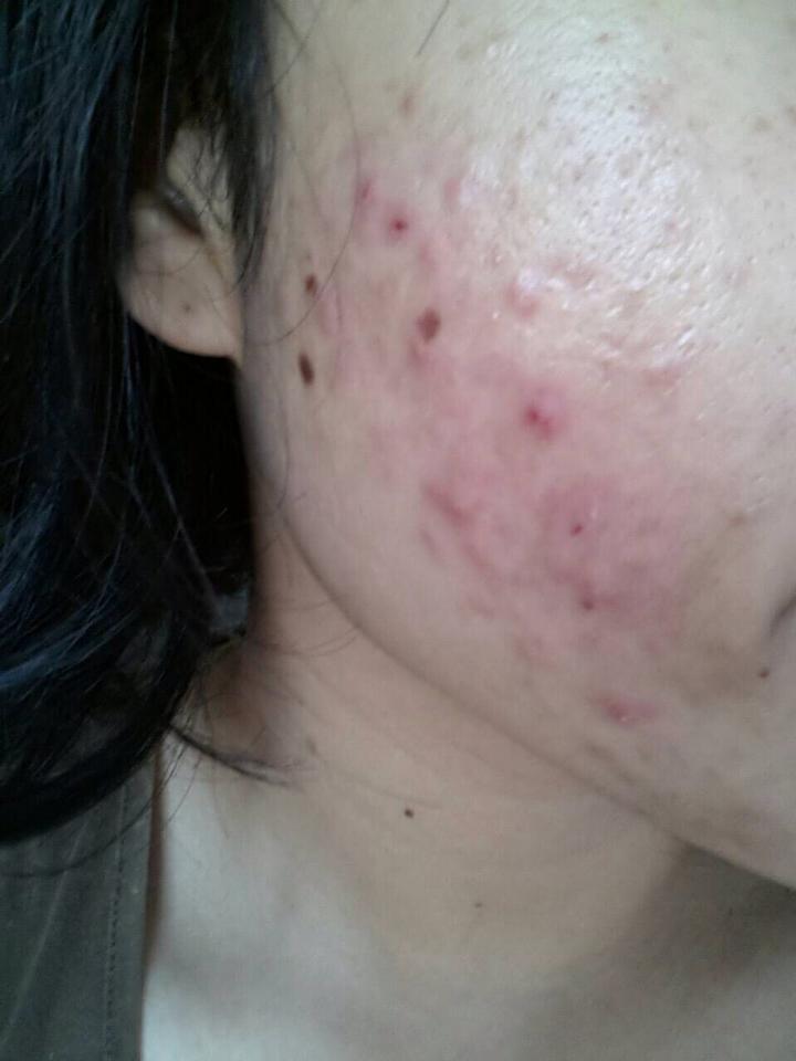 14-09-56นี่คือรูปก่อนไปหาหมอ 1วัน ตอนนั้นคือคิดว่าไม่ไหวแล้วรับกับสภาพหน้าตัวเองไม่ได้เลย พ่อกับแม่ก็ทนไม่ไหวเลยพาไปหาหมอคลินิคๆนึงวันรุ่งคืนทันที ,,,, ไปถึงก็บอกหมอว่าแพ้นู้นี่มา บลาๆๆๆ หมอจัดทั้งยากินยาทามาชุดใหญ่ อาทิตย์แรกสิวแห้งลง อาทิตย์ที่2 ก็กดสิวแล้วทายากินยาเหมือนเดิม อาทิตย์ที่3 หมอเห็นว่าสิวแห้งลงเลยเปลี่ยนหาให้เบาลง หลังจากนั้นก็มีสิวอักเสบขึ้นมาอีก ไม่รู้ว่าเป็นเพราะรักษาไม่ตรงกับสารตัวที่แพ้(เพราะไม่รู้ส่วนประกอบในโดสหน้า) หรือว่า ยังมีสารที่เราแพ้ตกค้างอยู่ใต้ผิวอยู่อีกช่วงนั้นหมดไป3000กว่าบาท,,,อาทิตย์ที่4 ไปหาวุฒิ.......ได้ยากินยาทา ทำทรีทเม้น ฉีดสิว หมดไปประมาณ3500 บาท ....แต่ 2อาทิตย์หลังมานี้เราไปให้อาเราที่เป็นหมอดูสถาพหน้า แล้วก็บอกว่าเคยใช้นู้นนี่มา ไปหาหมอที่อื่นกินยาอย่างนั้นอย่างนี้มา,,,,,อาหมอจ่ายยาตัวนึงมาให้เม็ดสีเขียวเข้มๆ ทานไป4 มื้อ สิวที่อักเสบยุบลงหมดเลย ตอนนี้เราก็กินยาที่อาหมอสั่งจ่ายมา3อาทิตย์แล้ว