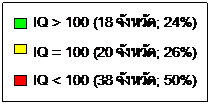 หมายเหตุ: การแบ่งเกณฑ์ด้วยค่า IQ = 100 ถือเป็นค่ากลางและเป็นค่าเป้าหมายที่ต้องการพัฒนา ซึ่งเทียบได้กับค่ามาตรฐานสากลในการสร้างเกณฑ์มาตรฐานของการทดสอบสติปัญญา