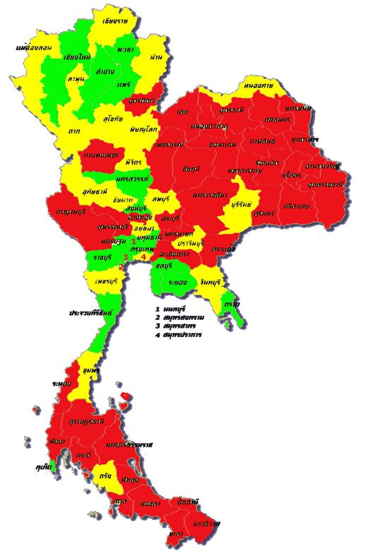 แผนที่ประเทศไทยแสดงผลการสำรวจระดับสติปัญญาเด็กนักเรียนไทย 2554