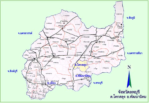 จากกรุงเทพฯ ใช้ทางหลวงแผ่นดินหมายเลข 1 (ถนนพหลโยธิน) เข้าทางอำเภอบางปะหัน ผ่าน อำเภอนครหลวง แล้วเข้าสู่ทางหลวงหมายเลข 3196 ผ่านอำเภอบ้านแพรก จังหวัดพระนครศรีอยุธยาเข้าสู่จังหวัดลพบุรี และอีกเส้นทางหนึ่งใช้ทางหลวงแผ่นดินหมายเลข 32 ซึ่งแยกจากทางหลวงแผ่นดิน หมายเลข 1 (ถนนพหลโยธิน) ผ่านไปทางจังหวัดพระนครศรีอยุธยา อ่างทองและสิงห์บุรีจากนั้นจึงใช้ทางหลวงแผ่นดินหมายเลข 311(สายสิงห์บุรี-ลพบุรี) ผ่านอำเภอท่าวุ้ง เข้าสู่ตัวจังหวัดลพบุรี แล้วให้ใช้เส้นทางไปสู่ อ.พัฒนานิคม เมื่อเจอทางแยกให้ใช้เส้นทางหมายเลข 3017 ขึ้นไปทางทิศเนือ โดยตัวตำบลอยู่ห่างจาก อ.เมืองประมาณ 70 กิโลเมตร