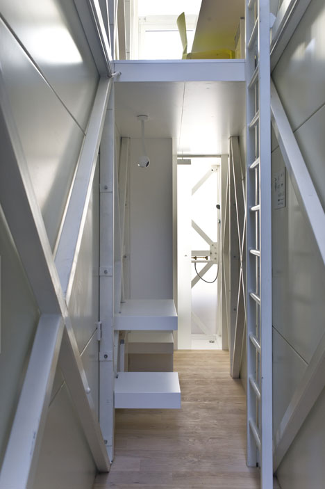 ตัวบ้านออกแบบเป็นรูปทรงสามเหลี่ยม โครงสร้างหลักเลือกใช้เหล็กเพื่อความสะดวก และรวดเร็วในการก่อสร้าง ภายในแบ่งส่วนเป็นชั้นครึ่ง ประกอบด้วยส่วนนั่งเล่น ห้องนอน ห้องน้ำ และห้องครัว การจัดวางพื้นที่ใช้สอยเน้นความคุ้มค่าและสามารถใช้งานได้จริง การตกแต่งก็ดูเรียบง่ายด้วยโทนสีขาวสะอาดตา ส่วนความพิเศษซึ่งเป็นที่พูดถึงอย่างมากก็คือ บ้านหลังนี้ถือเป็นบ้านที่แคบที่สุดเท่าที่เคยมีมาในประเทศโปแลนด์ เพราะส่วนที่แคบที่สุดของบ้านหลังนี้วัดได้เพียง 3.02 ฟุต (ประมาณ 90 เซนติเมตร) และส่วนที่กว้างที่สุดวัดได้ 4.99 ฟุต (ประมาณ 150 เซนติเมตร) มีพื้นที่ใช้สอยทั้งหมด 44 ตารางฟุต (ประมาณ 4 ตารางเมตร) เท่านั้น