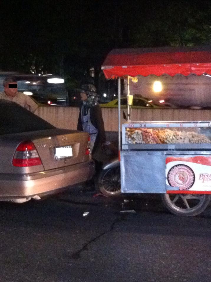เหตุเกิดเมื่อคืนที่ผ่านมา ณ แยกเกษตร...รถขายลูกชิ้น ชนท้ายรถเบ๊นซ์ ไฟหลังแตก กันชนหลังบุบ(โดนเหลี่ยมของรถขายลูกชิ้นเข้าพอดี)..สอบถามปรากฎว่ารถเบ๊นซ์เบรคกระทันหัน รถลูกชิ้นที่ขับตามมาเลยเบรคไม่ทัน ทั้งที่พยายามเบรคสุดตัวแล้ว และไม่ได้ขับเร็วด้วย..แต่ที่ต้องนำมาลงเพราะทนไม่ได้กับพฤติกรรมแย่ๆของตาลุงรถเบ๊นซ์