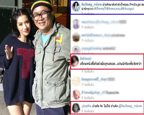 ล่าสุดเธอก็ถูกชาวเน็ตด่่าฟรีๆ หลังโพสต์รูปคู่สาว คิมเบอร์ลี่ ผ่านอินสตาแกรมส่วนตัว จนแฟนคลับตัวจริงของนางเอกสาวรุมเหน็บด้วยข้อความแสบๆคันๆ เท่านั้นยังไม่พอ…เมื่อนางอัพรูปคู่ ป๋าเต็ด ยุทธนา และเขียนบรรยายใต้ภาพแต่กลับพิมพ์ชื่อผิดเป็น ป๋าเต๊ก จนถูกเหล่านักเลงคีย์บอร์ดตอกกลับมิใช่น้อยเลยทีเดียว งานเข้าแบบไม่ตั้งตัวแบบนี้ สาวใบเตย คงปวดหัวเป็นทวีคูณเป็นแน่!!