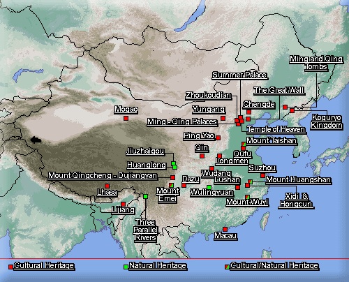 ประเทศจีนเป็นประเทศที่มีอาณาเขตกว้างใหญ่ไพศาลและเป็นอู่อารยธรรมของโลก นับจากที่ องค์การยูเนสโก ได้ลงมติพิจารณา เขาไท่ซัน แห่งมณฑลซันตงของจีน ขึ้นบัญชีเป็นมรดกโลกทางวัฒนธรรมและธรรมชาติในปีค.ศ. 1987 เป็นต้นมา สิ่งมหัศจรรย์ในแผ่นดินใหญ่ได้ค่อยๆเปิดตัวสู่สายตาชาวโลกในเวลาต่อๆมา จนถึงปัจจุบัน จีนมีสถานที่สำคัญที่เป็นมรดกโลกแบ่งเป็น มรดกโลกทางวัฒนธรรม 27 แห่ง มรดกโลกทางธรรมชาติ 7 แห่ง และมรดกโลกทางวัฒนธรรมและธรรมชาติ 4 แห่ง รวมทั้งสิ้น 38 แห่ง นับเป็นจำนวนมากที่สุดในประเทศแถบเอเชีย