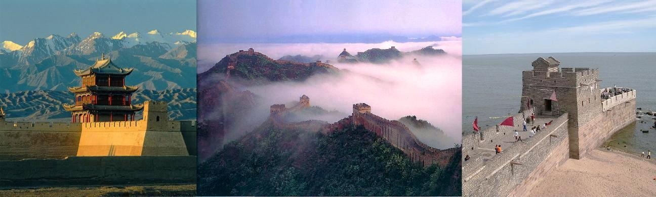 กำแพงเมืองจีนทอดตัวจากด่านซานไห่กวนทางด้านทะเลจีนตะวันออกผ่านภูมิประเทศต่างๆ จนถึงด่านเจียหยูกวนทางด้านตะวันตกที่เป็นทะเลทราย