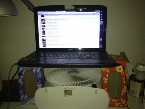 การเซ็ตแบบแรก เป็นการนำกล่องกระดาษทิชชู่มาตั้งทั้งสองข้าง และเอาพัดลมเป่าข้างใต้ สำหรับคนที่ไม่มีกะตังพอจะซื้อฐานพัดลมกันความร้อนของ Notebook นะครับ