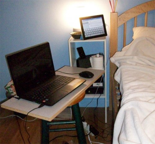 ผมว่ามีเพื่อนๆ หลายคนเซ็ต Notebook กันข้างเตียงนอนแบบนี้แหละโดยเอาเก้าอี้เป็นฐานแล้วพาดด้วยแผ่นไม้หนาๆ บางคนอาจเซ็ต PC แบบนี้เลยเหมือนกันนะ