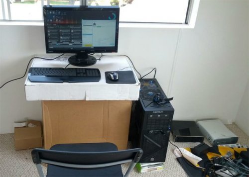 บางทีโต๊ะคอมมันก็แพงไป ลองเอากล่องลังกระดาษมาตั้งดู แล้วเอาฝาลังเป็นเหมือนหน้าโต๊ะ แต่รูปแบบนี้ ต้องใช้กับจอและ Gaming Gear น้ำหนักเบานะครับ