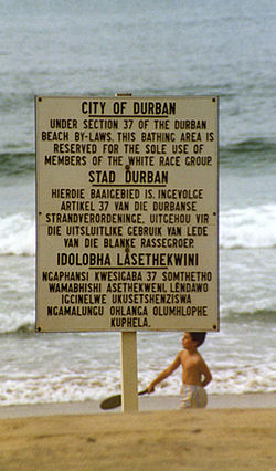 แผ่นป้ายการแยกผิวบนหาด Durban ในภาษาอังกฤษ ภาษาแอฟริกัน และภาษาซูลู