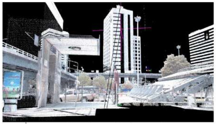 ภาพที่ 2 สถาบันนิติวิทยาศาสตร์แสดงภาพจำลองวิถีกระสุนปืน ตามตำแหน่งการยืนของ พล.ต.ขัตติยะฯ ตามภาพถ่ายที่มีบุคคลถ่ายภาพไว้ เมื่อเวลา 18:56 น.ในวันเกิดเหตุ โดยใช้กล้องถ่ายภาพแบบ 3D เลเซอร์