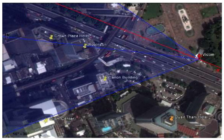 ภาพที่ 1 เป็นภาพจาก Google Earth โดยผู้เชี่ยวชาญอิสระด้านอาวุธ และกระสุนปืนจากต่างประเทศ แสดงสถานที่เกิดเหตุและอาคารสูง ทางด้านทิศตะวันตกของจุดที่ พล.ต.ขัตติยะฯ ถูกยิง ในบริเวณสีน้ำเงินจากการคำนวณทิศทาง การหันศรีษะในระยะ 30 องศา บริเวณเส้นสีแดง คือ ทิศทางกระสุนที่เป็นไปได้ กรณี พล.ต.ขัตติยะฯ หันหน้าตรงไปทางถนนพระรามที่ 4