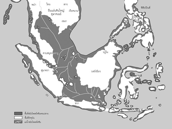 อุษาคเนย์แผ่นดืนเดียวกัน เมื่อล้านๆปีมาแล้ว มี “แผ่นดินซุนดา” (พื้นที่สกรีนดำ) เชื่อมโยงถึงกันทั้งแผ่นดินใหญ่และหมู่เกาะปัจจุบัน ตั้งแต่ตอนเหนือ (คือทางใต้ของจีนปัจจุบัน) ลงไปหมู่เกาะทั้งของฟิลิปปินส์, บรูไน, จนถึงตอนใต้สุดของอินโดนีเซีย เช่น สุมาตรา, ชวา ฯลฯ